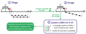 La méthode détaillée ci-dessous a été appliquée par chaque pêcheur. Dans un premier temps, le filage a consisté en la pose des filières sur le fond. Quelques jours plus tard, le pêcheur est revenu sur la zone pour effectuer le virage, c’est-à-dire la remontée des casiers à bord.