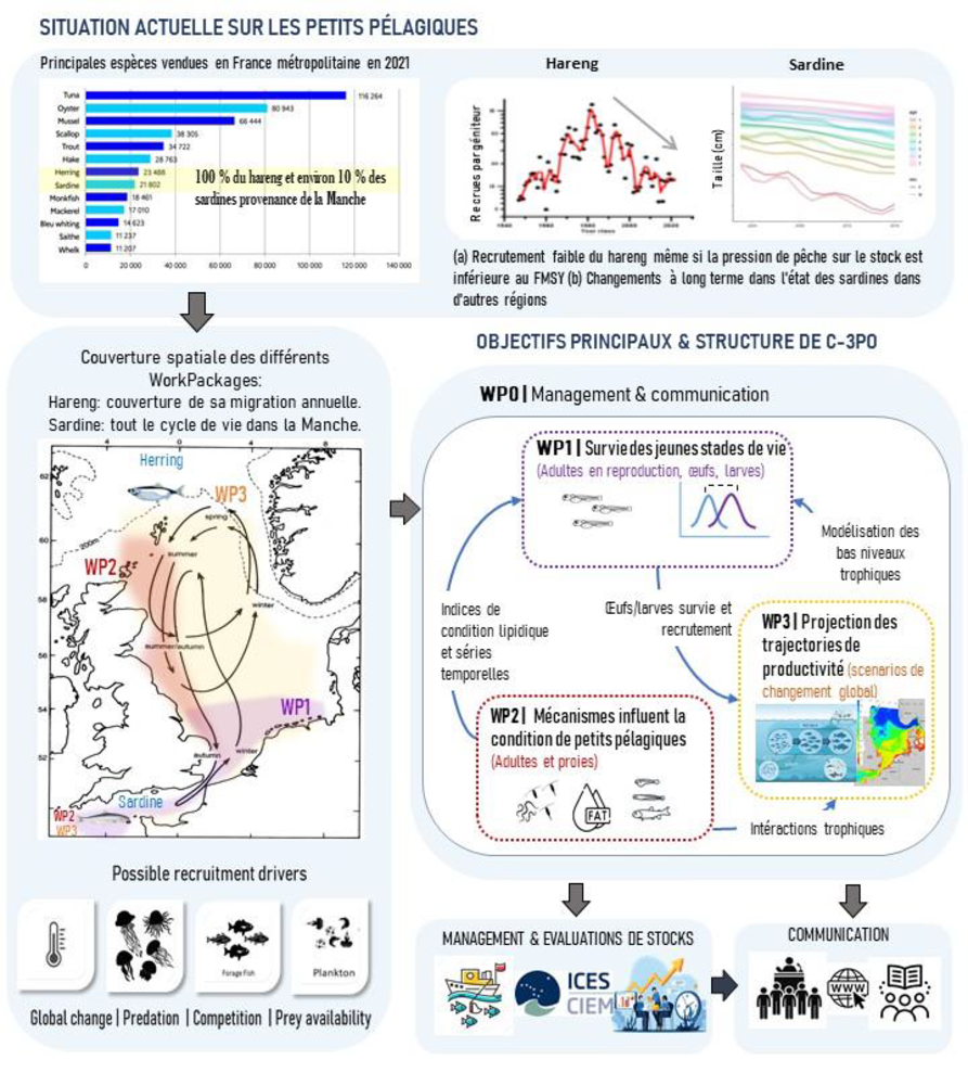 Le FROM Nord est partenaire du projet C3P-EAUX (Changements de Productivité des Petits Pélagiques en Manche et sud Mer du Nord), porté par l’IFREMER, qui vise à mieux comprendre la productivité du hareng des Downs et de la sardine dans un contexte de changement global. L’étude se concentrera sur les mécanismes influençant la condition des petits pélagiques, la survie des jeunes stades de vie ainsi que la projection des trajectoires de productivité en fonction des scénarios de changement global. Ce projet est financé dans le cadre de l’appel à projet « Enjeux actuels 2024 » de France Filière Pêche. Il regroupe différents partenaires scientifiques (MERCATOR-Ocean, Université d’Artois, Wageningen Marine Research) et professionnels (CME, Pelagic Freezer-Trawler Association). Le projet a démarré en mars 2025 et se clôturera en 2029.